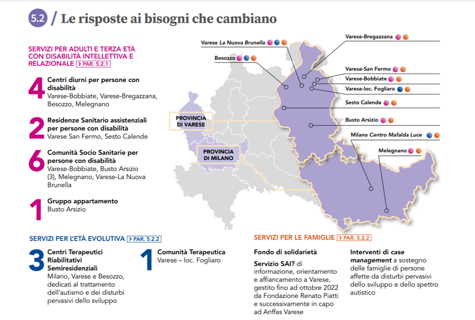 Si racconta di un anno – il 2022 – scandito da una parte da una lenta ma positiva ripresa della quotidianità dopo il periodo pandemico, dall’altra, dalle crescenti preoccupazioni per il conflitto russo ucraino e le sue pesantissime conseguenze. Ciò nonostante – come sottolinea il Presidente Emlio Rota nell’introduzione al volume – “le prospettive di cambiamento identificate negli anni precedenti sono state perseguite con decisione: da una parte continuando a rafforzare ed alimentare la nostra rete di servizi tradizionali in un’ottica di una sempre miglior risposta ai territori di appartenenza e, al contempo, diversificando la nostra capacità di risposta ai bisogni e di presa in carico, affiancando servizi innovativi e integrativi di privato solidale e acquisendo crescenti competenze per affrontare le sfide del futuro al servizio della qualità di vita delle persone con disabilità, come quello della sperimentazione di tecnologie abilitanti.”